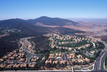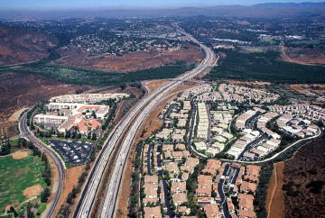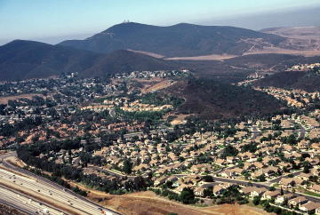 | Sabre Springs at Ted Williams This view looks east from I-15 across Sabre Springs Parkway. Ted Williams Parkway can be seen in the upper left. The undeveloped site just below Ted Williams is being developed as one of the Rapid Transit Centers planned by SANDAG as part of the I-15 Managed Lanes project. Special ramps being constructed will provide direct access to the HOV lanes. Evening Creek Drive runs along the bottom at the Sabre Springs Business Park. Behind the hills is Poway. |