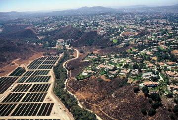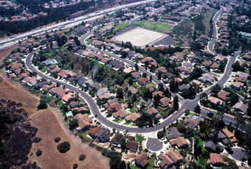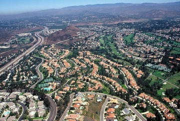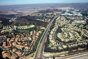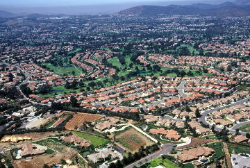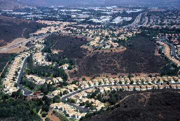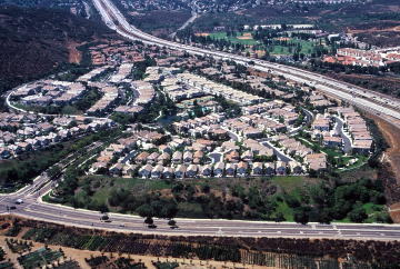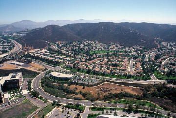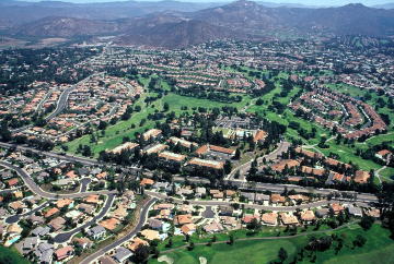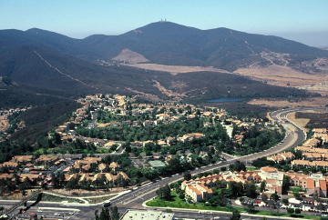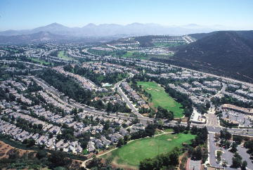 | Carmel Mountain Ranch This view looks east (from an area near I-15) across Rancho Carmel Drive. The Carmel Mountain Ranch Community Park is just off the lower right hand corner of the photo. Ted Williams Parkway winds eastbound from right to left across the upper half of the photo. Fairways 14 and 15 of the Carmel Mountain Ranch Country Club golf course are predominant in the picture. |