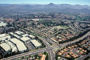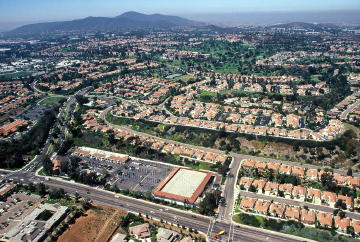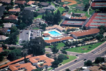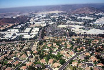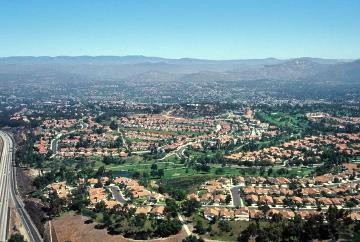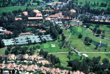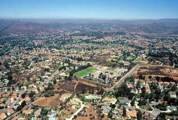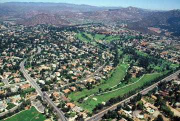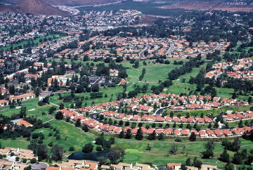 | Rancho Bernardo's Eastview This is the view looking north across the Rancho Bernardo community of Eastview. I-15 can be seen going up towards Escondido on the left side. Battle Mountain is near the top. The Rancho Bernardo Inn's tennis courts can be seen at the right center. Playmor and Greens West are at the bottom. The golf courses seen in this photograph are the RB Inn and the Country Club of Rancho Bernardo. The RB Community Park and Casa de las Campanas are upper left. |