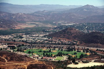 | Rancho Bernardo Community Park This is the view from the west looking across the RB Community Park. I-15 can be seen running from left to right (north to south). The community of Vista Del Lago is above the freeway, with Battle Mountain to its right. In the background, you can see the San Pasqual Valley and the RB Trails. The RB Community Park offers lighted fields for baseball, football, and soccer. It is also the site of the City's Recreation Building and the Joslyn Senior Center. And for our four-legged friends, the Rancho Bernardo Dog Park is now open. |