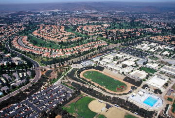 | Rancho Bernardo High School The lower half shows the campuses of RB High School and Bernardo Heights Middle School. These schools are in the Poway Unified School District. The football stadium and new RB Aquatic Center are visible. The view looks west across Paseo Lucido towards Bernardo Heights. The Bernardo Heights Golf Course is in the top half of the photo. In the far background, the Rancho Bernardo Business Park is west of I-15. |