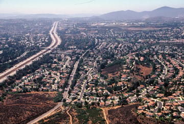 I-15 This is the view of Camino Del Norte running west from I-15 towards 4S Ranch. I-15 can be seen at the bottom. Camino Bernardo, The Villas apartments, and The Falls can all be seen to the left of Camino Del Norte. High Country West is to the right of Camino Del Norte, and Turtleback School is in the picture. 4S Ranch is in the background on the left. The RB Business Park is in the background on the right. |