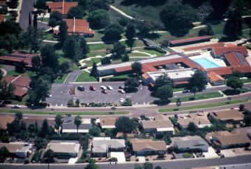 | Chaparral Elementary School Many students in Rancho Bernardo and North Poway attend Chaparral School, in the Poway Unified School District. The school actually sits between the cities of San Diego and Poway, and can be seen in the center of this photograph. This view is from southeast to northwest with Chaparral School in the center. Rancho Bernardo's Gatewood Hills is to the left of the school, and the Vineland Hills / Stoneridge area of North Poway is to the right of the school. The Oaks North Golf Course can be seen in the center background. |