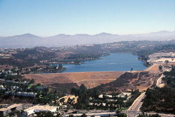 | Miramar Lake in Scripps Ranch This view looks east from Scripps Ranch Boulevard across the Miramar Reservoir. Scripps Lake Drive runs up along the right hand side of the photo. This is a beautifully scenic area in the city of San Diego. It offers fishing, hiking, and bicycling, with a 5-mile trail around the lake. The west end of the trail recently reopened after being closed for a few years. Each 4th of July, Scripps Ranch features running and bicycle events. |