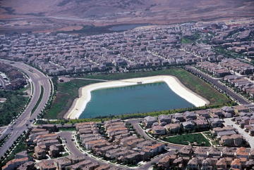 | 4S Ranch Reservoir This view is over 4S Ranch looking to the south, and was taken from above Camino del Norte. This is the "Wet Weather Storage" reservoir for reclaimed water. The water is processed across the street and used for landscape irrigation and other non-drinking purposes. Excess water is stored in the winter, so it can be used during the drier summer months. The water level typically rises in the winter and drops in the summer. This is an important water conservation project. Dove Canyon Road runs along the left side of the reservoir, and Lone Quail Drive runs along the bottom. |