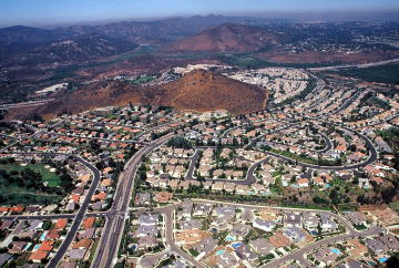 | Battle Mountain in Rancho Bernardo In the center of the photo, Pomerado Road curves around Battle Mountain towards I-15 and Lake Hodges. "Greens North" is on the left. Vezelay, Montelena, and Vista del Lago are on the right. I-15 runs south to north (from left to right) at the top. Above I-15 is the RB Community Park, Casa de las Campanas, Lake Hodges, and Escondido. Bernardo Mountain (top center) was recently purchased to be preserved as part of the San Dieguito River Park. |