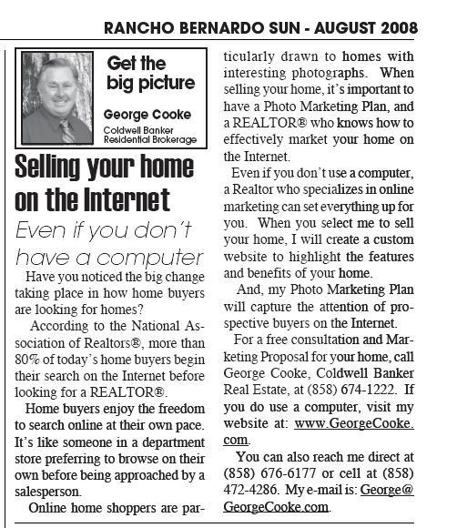 Have you noticed the big change taking place in how home buyers are looking for homes? According to surveys, including the National Association of Realtors®, more than 90% of today's home buyers begin their search on the Internet before ever looking for a REALTOR®. They enjoy the freedom to search on their own at their own pace. With property searches available on websites such as Realtor.com, CAmoves.com, and GeorgeCooke.com, shoppers can do their own browsing. It's like someone in a department store preferring to look on their own before being approached by a salesperson. Online home shoppers insist on having plenty of good pictures to look at. They are disappointed to find properties without enough good photos, and will skip ahead to look at the listings with multiple (interesting) photographs and Virtual Tours. When they see something they like, they will want a good REALTOR® who can guide them through the process. If you're selling your home, it becomes important to have a Photo Marketing Plan, and a REALTOR® who knows how to effectively market homes on the Internet. You need interesting photos to attract the attention of home buyers who are looking online. 90% of Home Buyers begin their search on the Internet before looking for a Real Estate Agent. When you list with me, your property will be prominently featured on-line with my Photo Marketing Plan and a Virtual Tour. It will also be shown as an enhanced listing on the major real estate websites, including Realtor.com, CaliforniaMoves.com, ColdwellBanker.com, and others. I use an aggressive marketing and advertising program to drive traffic to my website and each of my listings is featured on its own webpage at www.123MainStreet.com. I will personally market your home with professional materials, including a high gloss color brochure and color photo newspaper advertising. For a free consultation, market analysis, or marketing proposal for your home, please call me (George Cooke) at (858) 472-4286. Or send an email to George@GeorgeCooke.com. Click here to learn about the Current Market Value of your home. |